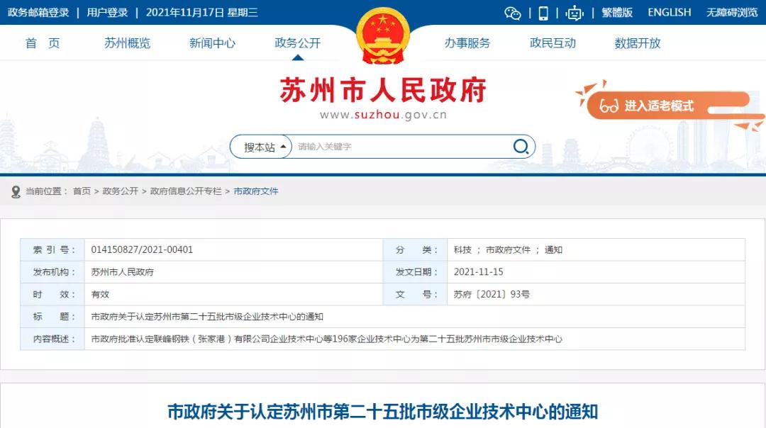 根据《苏州市市级技术中心认定管理试行办法》(苏府〔1997〕115号),由企业申报,经各地推荐和市工信局、市发改委、市科技局审核,市政府批准认定联峰钢铁(张家港)有限公司企业技术中心等196家企业技术中心为第二十五批苏州市市级企业技术中心(详见附件)。