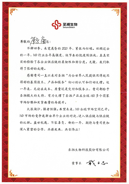 “不辨四季、未觉黄昏的2021年,紧张而忙碌。回顾过去的一年,IVD行业全年高强度、快节奏的抗疫保卫战,真真实实的检验了各企业供应链的柔韧性和契合性。无疑,我们取得了很好的成绩。感谢贵司一直以来对圣湘“为全世界人民提供用得起用得好的基因技术、产品和服务”初心的认可和行动支撑。这一年来,无论在成本、质量还是交付和服务上,贵司都给予圣湘极大的支持,有力支撑了圣湘产品在全球160多个国家份额和发货数量的再提升。