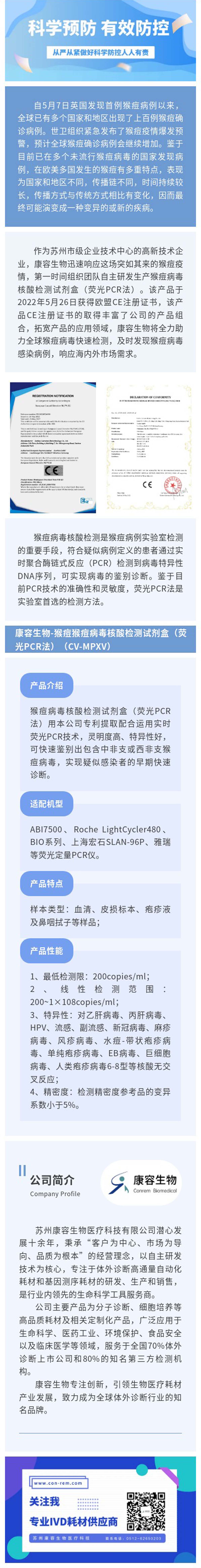 重磅消息!康容生物猴痘病毒核酸检测试剂盒(荧光PCR法)获欧盟CE认证!